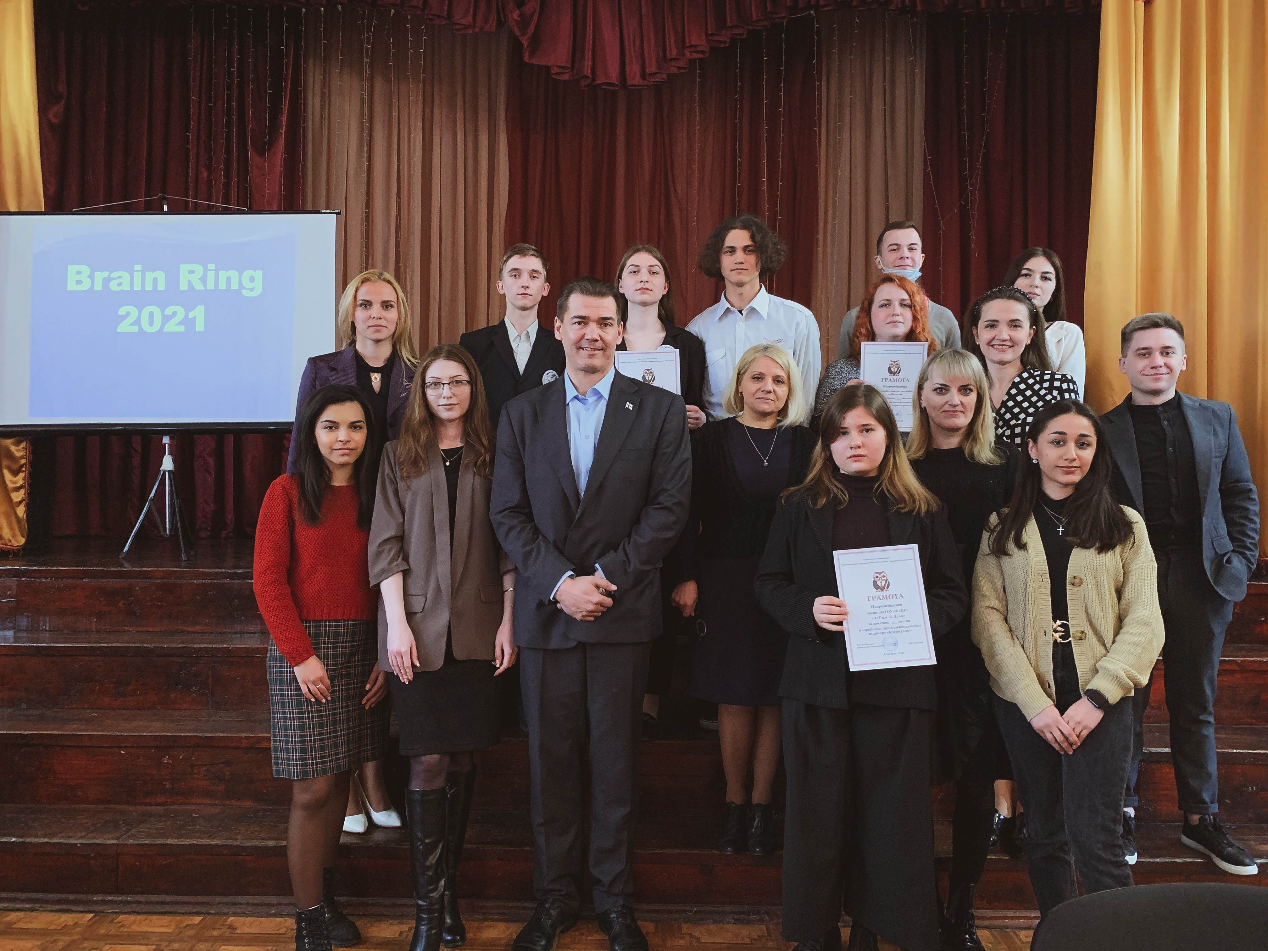 28 апреля 2021 года в Алчевском коллегиуме № 1 им. Христины Алчевской в рамках международного сотрудничества и проведения образовательного эксперимента, прошла интеллектуальная игра «Брейн- ринг» на английском языке между командой обучающихся коллегиума, студентами факультета экономики и бизнеса Луганского государственного университета имени Владимира Даля и командой Совета молодых педагогов Алчевска.